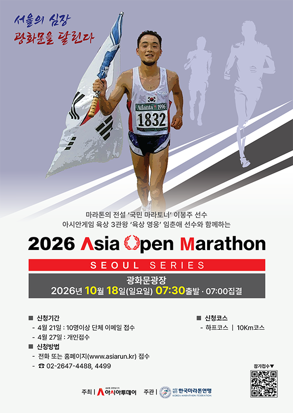 2026 2026 아시아 오픈 마라톤대회 아시아 오픈 마라톤대회 📅 대회일시 : 2026년 10월 18일(일요일) 07:30 출발 (07:00 집결) 📍 대회장소 : 광화문광장 🏅 대회코스 : 2종목 (하프코스, 10km) 📝 접수기간 : ① 4월 21일 : 10명이상 단체 이메일접수 ※ 홈페이지 단체접수 양식으로 접수 받습니다. ② 4월 27일 부터 개인접수 ※ 선착순 15,000명, 조기마감할수도 있습니다. 개인참가신청 단체참가신청